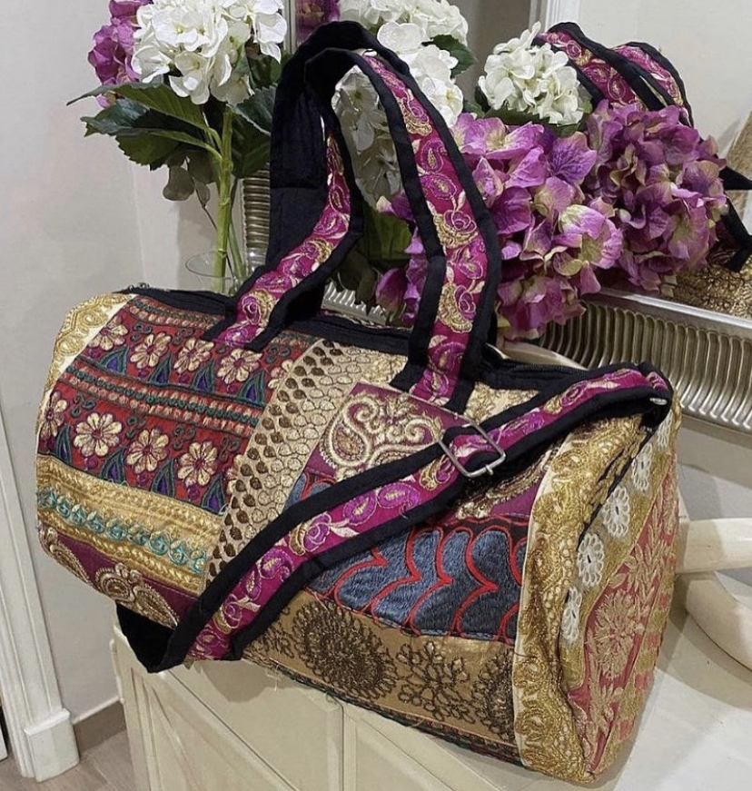Bolsas viaje fabricadas con distintas telas, espejitos y adornos en brocado. Una pieza única y exclusiva ideal para tus viajes y escapadas de fin de semana.